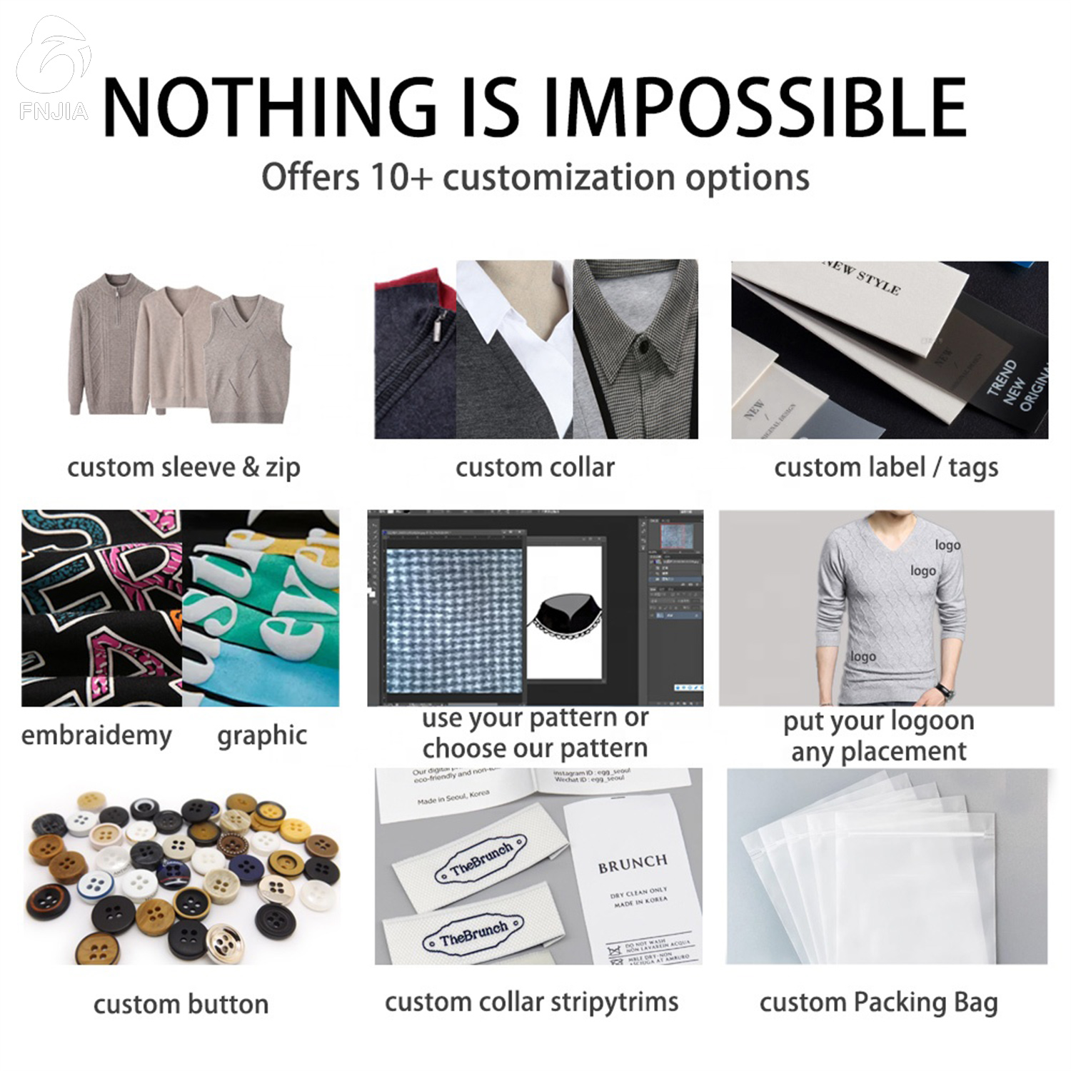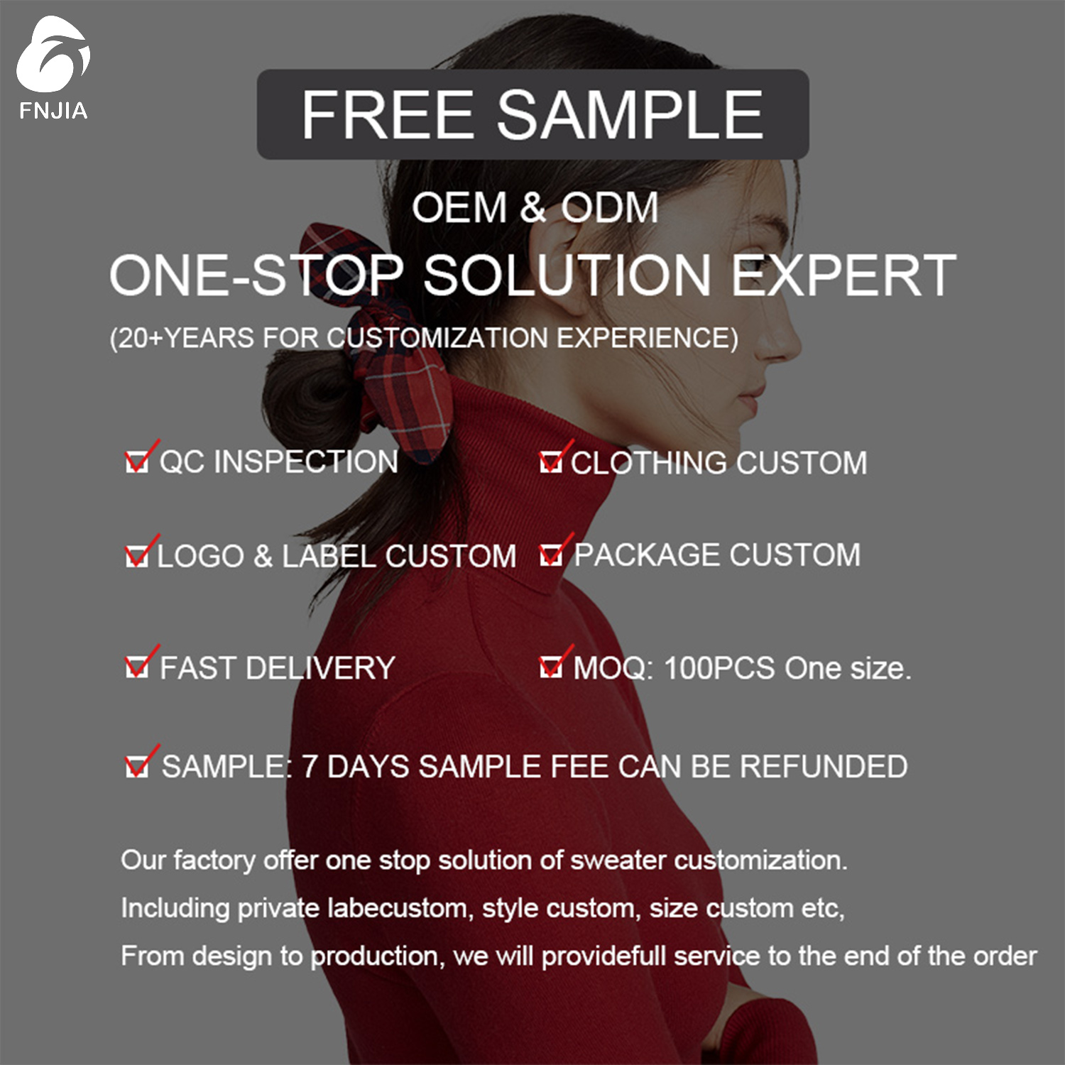 Решение FNJIA: Полная настройка в соответствии с Вашим уникальным видением Мы специализируемся на воплощении ваших дизайнерских идей в реальность, какими бы сложными они ни были. Наши фабрики (специализирующиеся на производстве модного трикотажа, рождественского трикотажа и тканых изделий) используют широкий спектр передовых технологий: