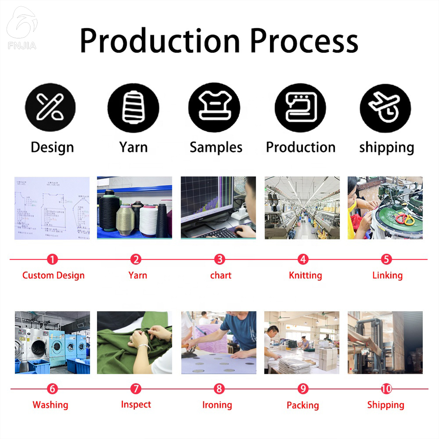 Решение FNJIA: 20-летний опыт + строгий контроль качества Наше обещание качества начинается с нашей команды: инженеры с 20-летним опытом работы контролируйте каждый этап производства, выявляя возможные улучшения в ваших моделях и следя за тем, чтобы они соответствовали самым высоким стандартам. Перед поставкой каждое изделие из трикотажа проходит тщательную проверку Контроль качества—в результате чего пропускная способность более 99% для наших продуктов. Мы также проводим Сертификация BSCI это мировой стандарт этичного и качественного производства, поэтому вы можете быть уверены, что трикотаж, изготовленный на заказ, будет не только качественно изготовлен, но и произведен ответственно.